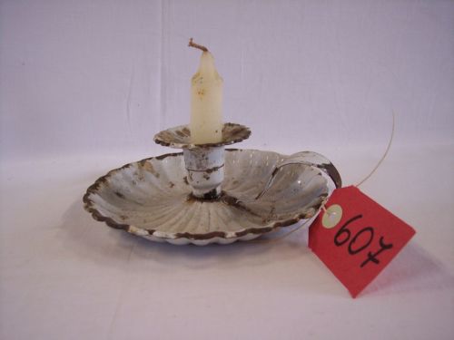 oggetto costituito da un piatto circolare modellato a cappe con parte centrale leggermente rialzata; al centro porta candela cilindrico con bordo estroflesso ampio; ansa a nastro che parte dal centro del piatto e si lega al suo bordo