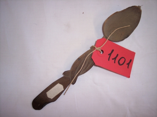 utensile in legno costituito da una parte superiore di forma ovoidale incavata e da una impugnatura rettangolare con base arrotondata, piatta con decorazioni intagliate a motivi vegetali