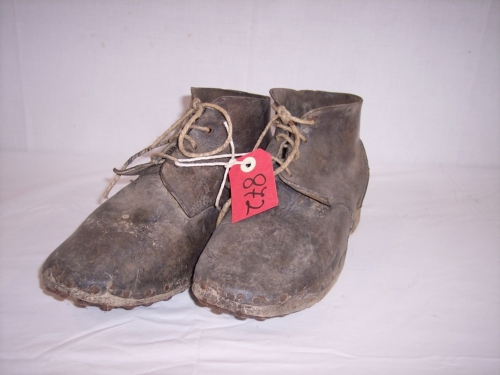 oggetto da indossare ai piedi costituito da una suola in legno naturale con chiodi nella parte inferiore; tomaia di cuoio naturale in tre pezzi, punta stretta e arrotondata; collo alto con linguetta; allacciatura con spago che passa attraverso otto piccoli fori posizionati nel cuoio che copre la parte superiore del piede