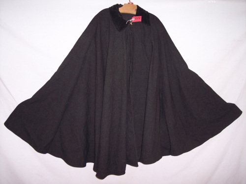 mantello in lana grigio antracite con apertura circolare nella parte superiore ricoperta da colletto rivestito in velluto nero con le estremità appuntite e parte inferiore semicircolare; chiusura anteriore con catenella metallica