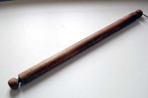Lungo cilindro in legno con estremità assottigliate che si allargano in due pomelli, uno dei quali è forato, mentre sullaltro è inserito un gancio metallico che trattiene lo spago che serve ad appendere loggetto