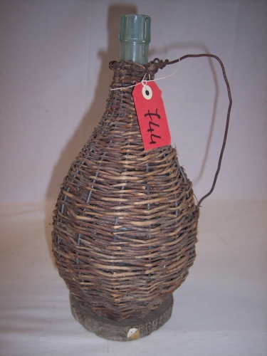 oggetto costituito da una intelaiatura in filo di ferro a forma di tronco di cono rivestita di vimini intrecciati, con un corto collo, svasata verso il basso, che si restringe alla base fatta da un disco in legno, manico sporgente ad arco in filo di ferro e da una bottiglia di vetro