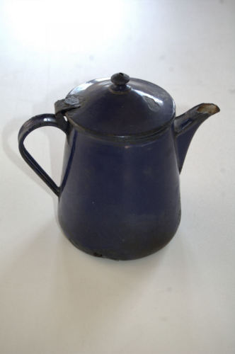 recipiente in ferro, smaltato di blu allesterno e di bianco allinterno; di forma cilindrica rastremata, con spigolo superiore arrotondato; provvisto di beccuccio sporgente e, sul lato opposto, di manico ad occhiello, le cui estremità sono saldate alla superficie del recipiente; il recipiente è provvisto anche di un coperchio circolare, leggermente rialzato al centro e dotato di pomello centrale; il coperchio è fissato al recipiente mediante un perno mobile