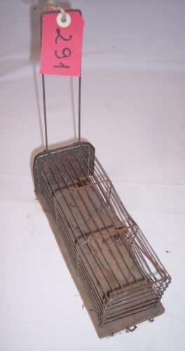 oggetto costituito da una tavoletta di legno rettangolare piana sulla quale è inserita una gabbia a forma di parallelepipedo con porticina in lamiera collegata alla molla