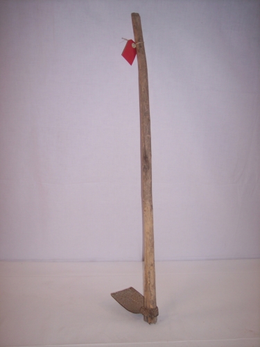 Oggetto costituito da una lama quadrata con un lato semicircolare vicino allanello che serviva per fissarla al manico perpendicolarmente e da un manico lungo in legno a sezione circolare
