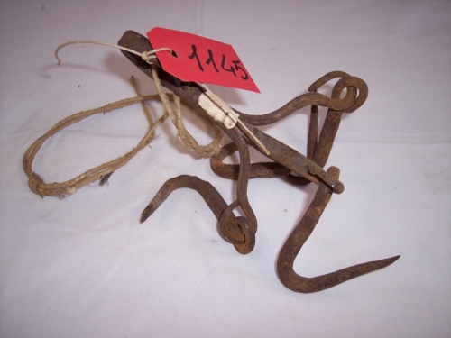 Oggetto costituito da una barra di ferro a sezione quadrata (fuso) con un'estremità divisa in quattro bracci in ferro ondulati terminanti ad anello nei quali sono inseriti altrettanti ganci appuntiti piegati a forma di uncino, mentre laltra estremità è piegata ad anello