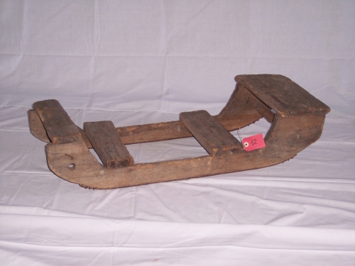 oggetto a forma di parallelepipedo cavo, in legno, con la parte anteriore e la parte posteriore costituita da tavole di legno di forma rettangolare (i sedili) collocate orizzontalmente sopra le estremità soprelevate di due pattini paralleli, rettangolari, poggianti sul lato lungo; sulla parte centrale dei pattini sono inchiodate trasversalmente due tavole rettangolari piane (fungenti da poggiapiedi)