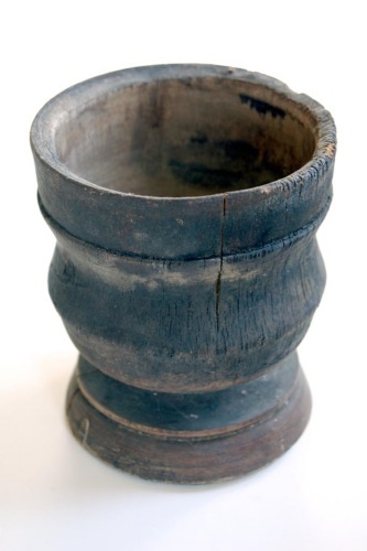 Recipiente in legno a sezione circolare con modanatura esterna decorativa e fondo concavo; poggiante su una base rotonda modanata.
