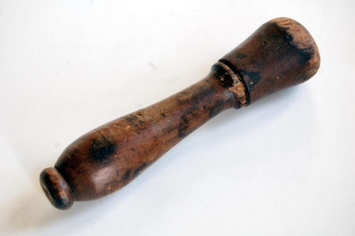 utensile in legno di forma cilindrica con estremità inferiore allargata e arrotondata, sagomato e modanato a scopo decorativo