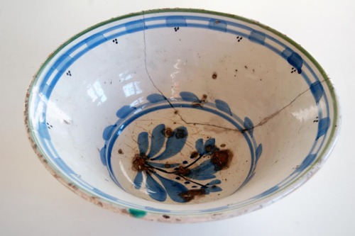 Recipiente di forma circolare con bordo alto svasato e spigolo arrotondato; il diametro del piede è circa un terzo del diametro del bordo superiore; in terracotta smaltata allinterno di bianco e allesterno rivestita di gesso; decorazione interna a motivi geometrici e vegetali azzurri e bordo superiore verde.