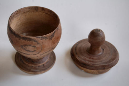 recipiente in legno a sezione circolare, poggiante su una base rotonda modanata. Dotato di coperchio circolare con chiusura ad incastro ed impugnatura centrale a pomello