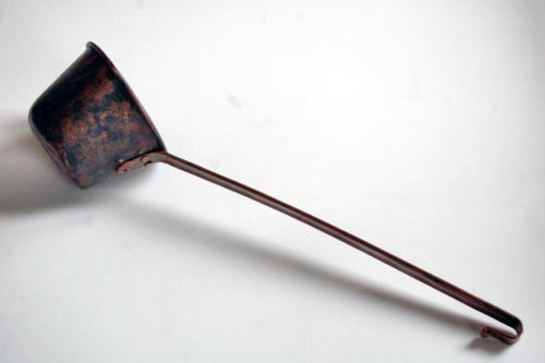 utensile in rame composto da un manico piatto terminante ad uncino con ricciolo ad unestremità, e da un recipiente di forma tronco conica, a fondo concavo con un beccuccio sul bordo superiore arrotondato. Lestremità inferiore del manico è fissata al recipiente tramite tre borchie in rame; interno rinforzato da bandella in rame fissata con quattro borchie.