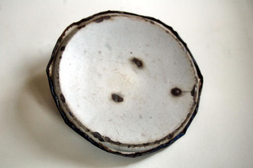 oggetto in ferro di forma circolare a calotta; con bordo rialzato e ripiegato verso linterno; dotato di manico arcuato, saldato sulla sommità del coperchio stesso. Smaltato di colore blu sulla sommità e di bianco allinterno