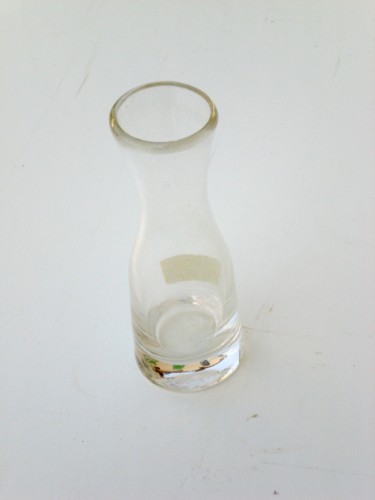 Piccolo recipinte in vetro trasparente di capienza pari ad un decimo di litro. Il corpo centrale si stringe verso il collo per poi allargarsi nouvamente verso la bocca.