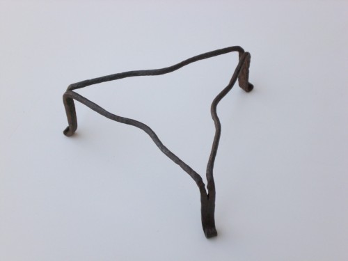 struttura in ferro a forma triangolare, con una rientranza concava alla metà di ogni lato, sorretta da 3 piedini posti ad ogni angolo. I piedini sono formati dallincontro dei due lati del triangolo fusi assieme. I piedini terminano in un ricciolo decorativo.