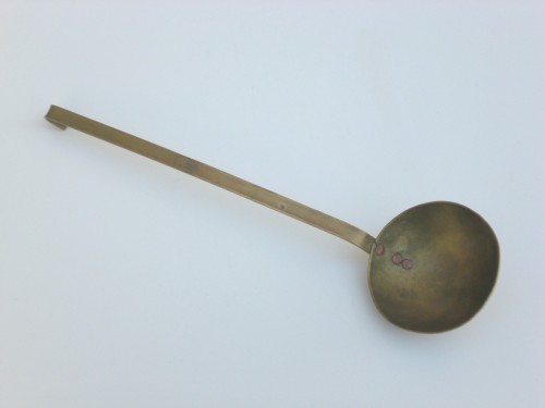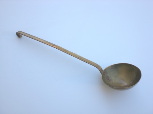 utensile in ottone, formato da un manico lungo ed un corpo a forma di semisfera unito al manico tramite tre piccoli chiodi in rame. Il fondo del manico è ripiegato a formare un gancio per appendere il mestolo.