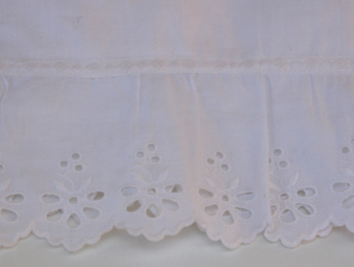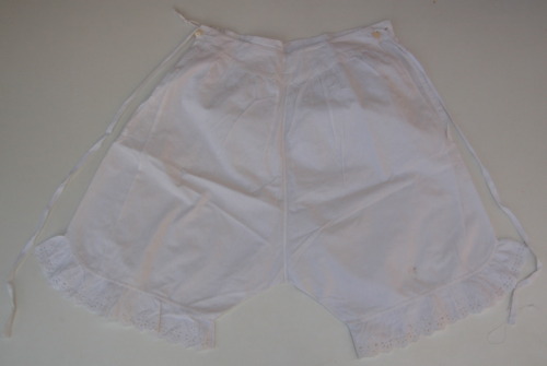 lunghe, in cotone bianco, con cinturino che termina leggermente a punta sul davanti e sotto il quale il tessuto è arricciato. La chiusura è posta ai lati dove si trovano due spacchi #scrìz# (24.5 cm) chiusi da un bottoncino #botòi# in plastica madreperlata e vicino al quale è stata cucita una fettuccia bianca #cordéla# utilizzata probabilmente per allacciare meglio le mutande alla vita. Lestremità inferiore è bordata da un merletto #mérlo# bianco in sangallo fissato con una stretta fettuccina bianca decorata da ricami artigianali #spigéta#