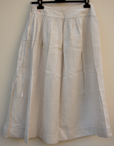 lunga sottana di colore bianco con cinturino caratterizzato da un taglio leggermente obliquo e chiuso sul lato destro da un bottone #botòi# in plastica madreperlata e da una fettuccia bianca. Sotto il cinturino il tessuto si arriccia molto. Sul davanti, vicino al bottone, sono ricamate con filo rosso, a punto croce, le iniziali della proprietaria A.M.B: Annetta Miari Bentivoglio, la moglie del conte Tito Bentivoglio