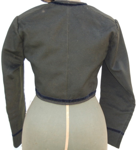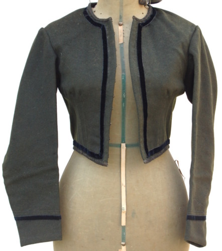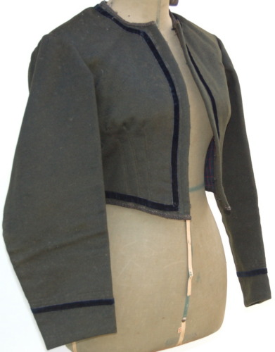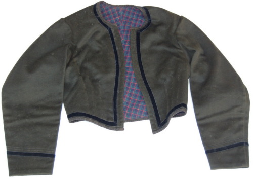 in #medalàna# verde scuro a busto corto con vita aderente, scollo tondo e abbottonatura sul davanti tramite dieci piccoli ganci metallici cuciti nella parte interna della bordatura. Il collo e i bordi inferiori sono profilati con una fettuccia rigata di colore verde scuro e verde chiaro; mentre i bordi dei polsi #damàni, manegòti, polsìni# e del giacchino sono decorati con una fettuccia di velluto #velùdo# nero che scorre loro parallela. Le maniche sono sagomate secondo la curvatura del braccio. La fodera #fòdra# in cotone presenta una quadrettatura di colore blu, rosso e verde chiaro