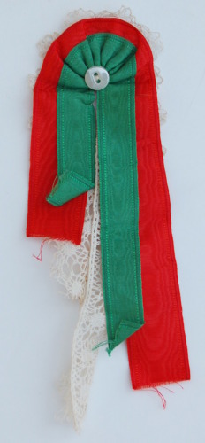 tre segmenti di varia fattura - pizzo bianco, nastro rosso (2.5 cm) e nastro verde (1.5) - sovrapposti, modellati, cuciti e trattenuti da un piccolo bottone in vetro bianco