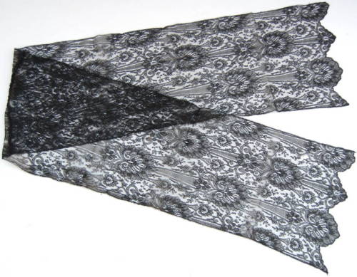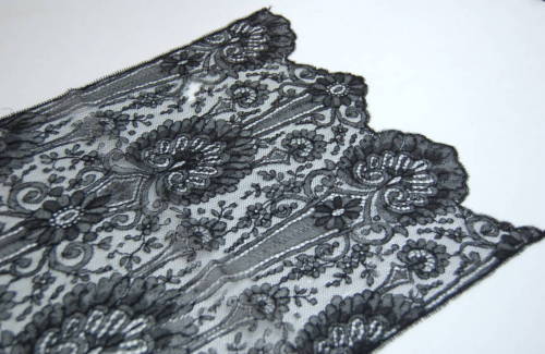 due scampoli di tulle nero, con ricami ed estremità merlata, uniti lungo il lato più corto attraverso una cucitura e una fettuccia in raso arricciata