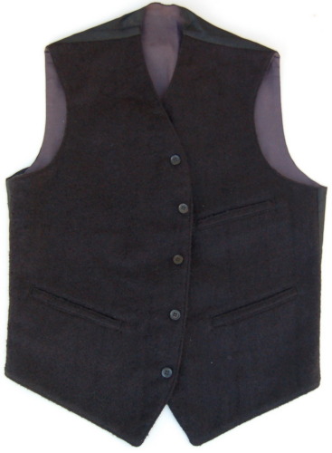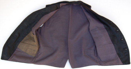 scollo a V, abbottonatura tramite cinque bottoni #botòi# di plastica nera, due tasche #scarsèle# a filetto e un taschino #scarselìn# di taglio obliquo posto a sinistra. Il retro è stato realizzato con una stoffa di diverso tipo, un cotone lucido nero, e presenta un piccolo spacco centrale e un cinturino con fibbia #fiùba# metallica che ne regolava lampiezza. La fodera #fòdra# in cotone è grigio-violacea e nera. Allinterno, sulla destra, cè una tasca in tessuto di cotone verdastro chiusa da un piccolo bottone marroncino