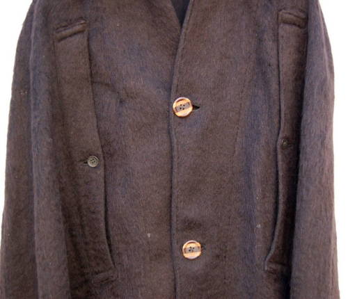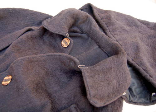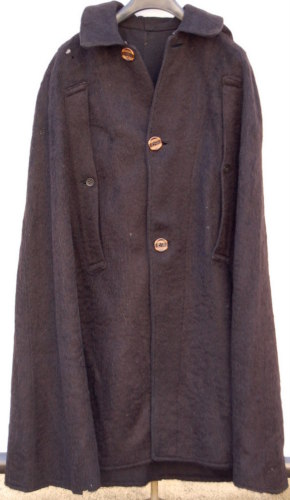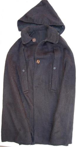 scollo tondo con colletto rafforzato da varie cuciture #cusidùre# parallele e al quale è agganciato, tramite cinque bottoni #botòi#, un cappuccio. Abbottonatura con tre grossi bottoni di plastica marrone e un gancio metallico finale. Sul davanti, ai lati, sono presenti due aperture per le braccia chiuse da un bottone nero. La lana nera utilizzata è simile a quella degli altri elementi del vestito, ma presenta un pelo più lungo e morbido