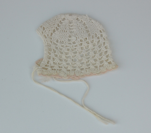 Di cotone bianco, lavorata ad uncinetto a punto catenella, punto rete e punto alto doppio. Il bordo inferiore si conclude con un motivo a cappette ( punto festone) ed un punto catenella realizzato con filo di cotone rosa. Alle due estremità sono presenti due fettucce di cotone che permettono di allacciare la cuffietta sotto il mento.