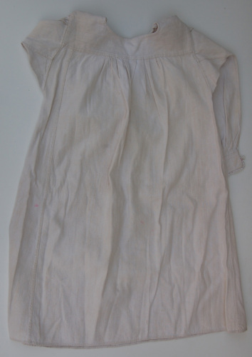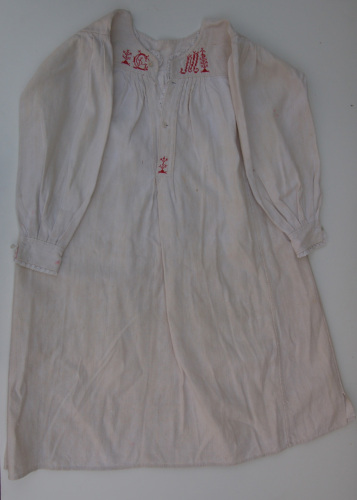 In canapa bianca #tela da ninziòi# a maniche lunghe. Sul davanti presenta un'apertura con abbottonatura ad asole. I bottoni sono tre di plastica bianca così come i bottoni ( due in totale) presenti sui polsini delle maniche. Sullo scollo e sui polsini è applicato un merletto fatto a macchina. Sul carrè sono ricamate a punto croce in filo rosso due lettere G e M. Sulla zona dellabbottonatura sempre a punto croce e con filo rosso è ricamato un motivo floreale stilizzato. Sotto il carré il tessuto si arriccia irregolarmente e si modella a piegoline (sul davanti e sul retro). Arricciatura presente anche sui polsini. Lateralmente la camicia da notte presenta due piccoli spacchi. Nella zona dellascella è presente un tassello quadrato per dare più mobilità al braccio.