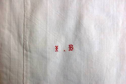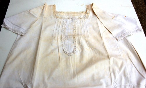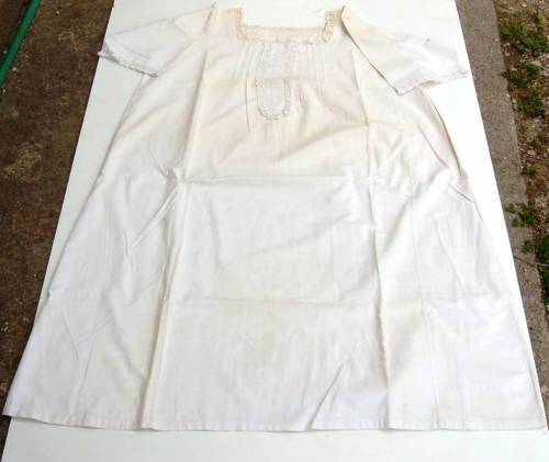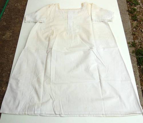 In cotone bianco a maniche corte. Sul davanti presenta unapertura con abbottonatura ad asole. I bottoni sono due di plastica bianca. Il carré è tutto ricamato a punto erba con motivi floreali. Lo scollo come il bordo delle maniche e la zona dellabbottonatura è lavorato a punto festone. Dietro, sotto il carré, sono presenti due riprese. Davanti, in basso, sono ricamate a punto croce con filo rosso due lettere I e B. Ai lati, in basso, sono presenti due inserti laterali a triangolo.