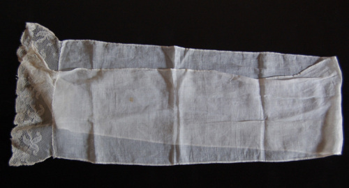 Di forma rettangolare. In cotone bianco,"pelle d'uovo", con due inserti in pizzo fatto a macchina con motivi floreali alle estremità. Il pizzo termina con un motivo lobato.