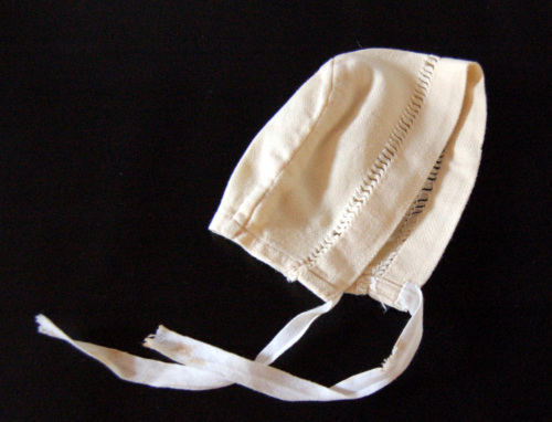 Di cotone giallo, composta da due pezzi assemblati a macchina. Alle due estremità inferiori sono presenti due fettucce che servono per legare la cuffietta sotto il mento. Tuttintorno è presente un decoro traforato a punto quadro(?).