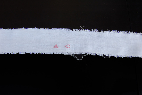 Di cotone bianco sfrangiato. Ad una delle due estremità è cucita una fettuccia di cotone bianco. Circa a metà della fascia sono ricamate con filo di cotone rosso a punto croce le lettere A.C.