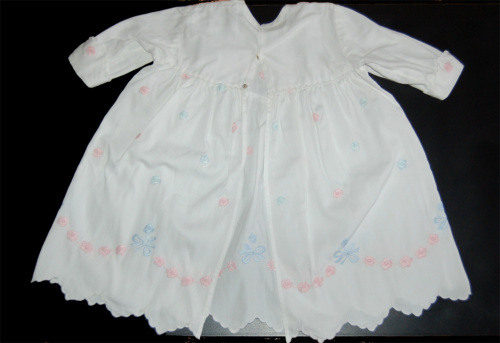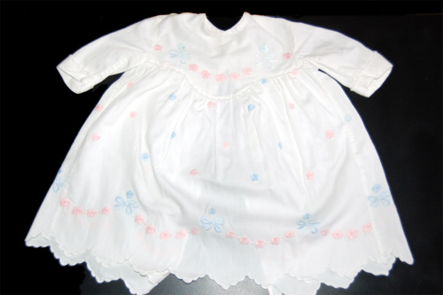 In cotone bianco con ricami floreali e fiocchi di colore rosa e celeste. Produzione industriale. La chiusura sul retro è formata da tre bottoncini di plastica a pressione. Dal carré parte un'arricciatura. Il vestito termina con lorlo a punto festone. Le maniche, corte, presentano un risvolto terminante a punto festone.