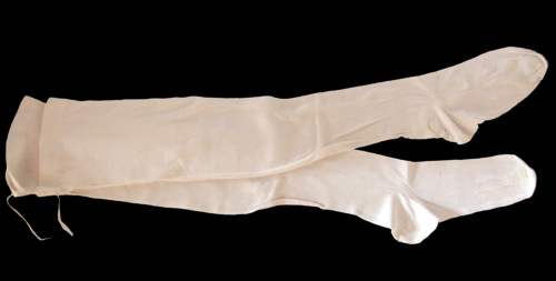 In cotone bianco. Due laccetti posti sull'apertura. Assemblate a mano. Su una delle due calze, in alto a punto croce in filo rosso, sono ricamate due lettere: I P e sotto a queste il numero 21.