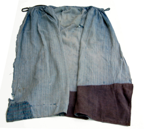 In tela di cotone grossa, azzurra con delle righette rosse, presenta un arricciatura sotto la cintura. Nella parte anteriore centrale è presente un rinforzo. E' cucita tutta interamente a mano. Si tratta di due pezzi di stoffa uniti centralmente (con una cucitura) e di una cintura.