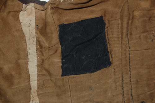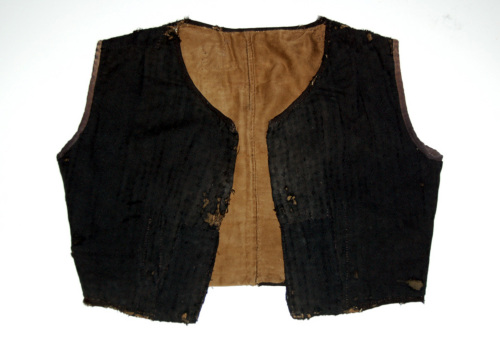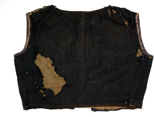 Presenta un rivestimento esterno in mussola di lana nera operata e un rivestimento interno di rasatello di cotone color senape. E' composto da quattro pezzi assemblati a mano. Ha uno scollo a v e l'abbottonatura sul davanti(non a vista) è formata da dei gancetti metallici in tutto undici (ma ne mancano tre). Internamente sul lato sinistro vi è applicato un taschino di cotone grosso nero.