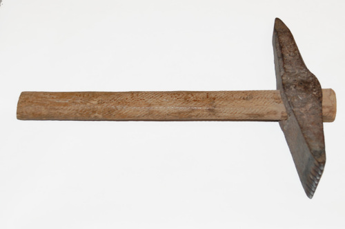 FUNZIONE E MODALITÀ D'USOusata sia nellultima fase della levigatura sia nella rifinitura della superficie lapidea, #martelinàr#. Lascia un segno più strisciato e allungato della bocciarda. Questa martellina in particolare era da #scaiàr#, cioè serviva per il lavoro di rettifica delle superfici fatto battendo di spigolo