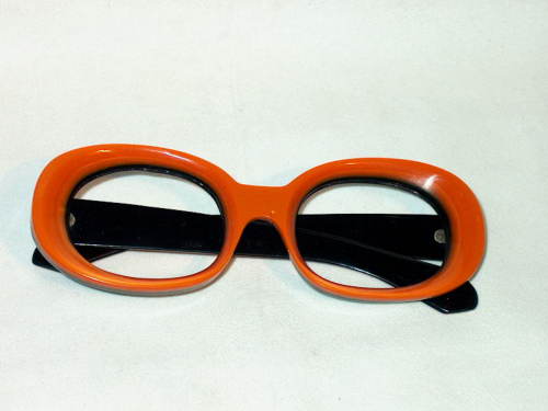 Questa montatura è costruita con celluloide bicolore (arancione - nero) e mostra oculari dalla forma ovaleggiante.[Descrizione estratta dal database del Museo dell'Occhiale].