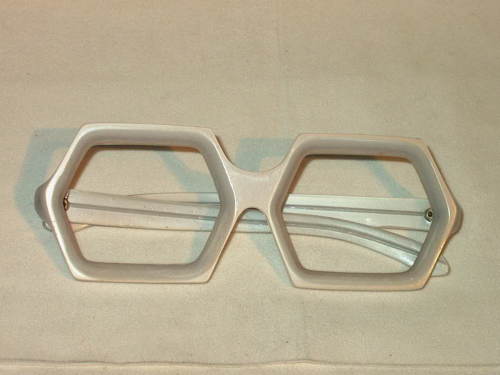 Questa montatura è costruita con celluloide color ghiaccio con oculari esagonali.[Descrizione estratta dal database del Museo dell'Occhiale].