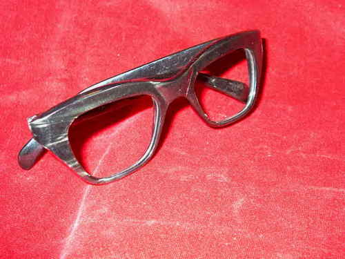 Questa montatura è in celluloide nera, con effetto madreperlaceo. [Descrizione estratta dal database del Museo dell'Occhiale].