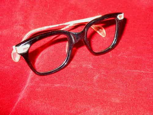 Questa montatura presenta gli oculari in celluloide nera, lucida e le stanghette in metallo. I terminali sono ricoperti con plastica trasparente. [Descrizione estratta dal database del Museo dell'Occhiale].