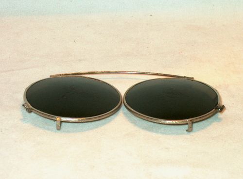 Gli occhiali da protezione, da usare su un altro paio di occhiali, portano le lenti rotonde, colorate in grigio-verde. La montatura è in metallo.[Descrizione estratta dal database del Museo dell'Occhiale].