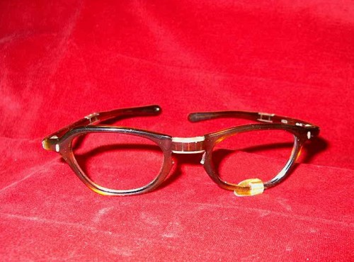 Gli occhiali, in materiale sintetico, presentano la particolarità, per mezzo di snodi sul nasello e sulle astine, di essere ripiegati su sé stessi. All'interno delle astine il timbro: LOZZA 44-22.[Descrizione estratta dal database del Museo dell'Occhiale].