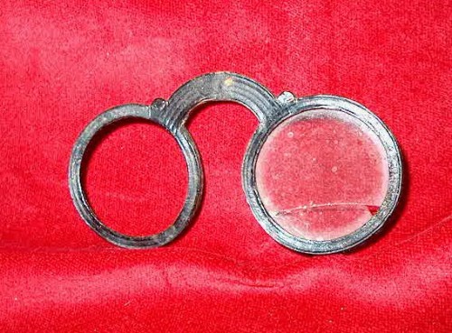 L'esemplare, in cuoio, privo di stanghette, porta oculari rotondi. Colorato in nero, monta una lente da presbite e reca un'impressione al centro del nasello, riconducibile ad un quadrifoglio o ad una croce ed altre impressioni parallele alla curvatura del ponte che anticipano modelli con ponte a cinque lame..[Descrizione estratta dal database del Museo dell'Occhiale].