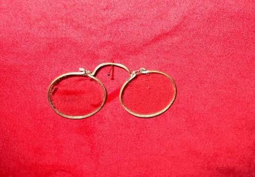 L'esemplare, in metallo, costituito da un unico pezzo nella montatura, reca lenti rotonde. [Descrizione estratta dal database del Museo dell'Occhiale].