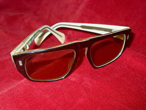 Questo esemplare, in plastica, ha la mascherina esterna colorata in nero e quella interna in trasparente. Le astine sono rinforzate. [Descrizione estratta dal database del Museo dell'Occhiale].