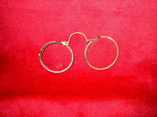 Occhiali ad arco in rame, firmati MICHAEL GALSTER - Francoforte. L'esemplare è completamente rivestito sulla montatura da un filo di seta sottilissimo. Si fanno risalire approssimativamente al 1730. [Descrizione estratta dal database del Museo dell'Occhiale].