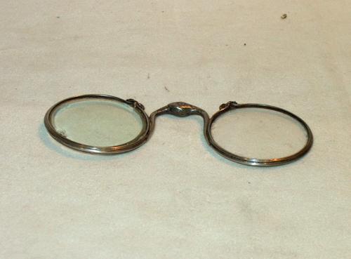 Gli occhiali sono in argento e uno snodo nel centro del ponte ne permette la chiusura simmetrica. Questo tipo di montatura tornò in voga nel Settecento in quanto la possibilità di piegare gli occhiali consentiva un ingombro minimo. Sull'esterno della montatura si notano una serie di torniture concentriche e parallele alla lente. [Descrizione estratta dal database del Museo dell'Occhiale].