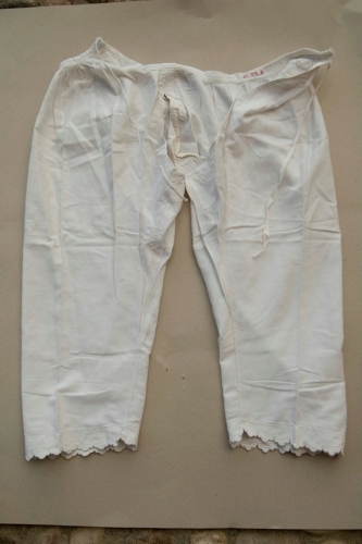 lunghe di colore bianco in tessuto di cotone piqué. In vita sono aperte sul davanti, ci sono due fettucce con coulisse per la chiusura. L'estremità inferiore è decorata da un ricamo pieno a rilievo. All'altezza della vita sul dietro all'interno sono ricamate a punto croce con filo rosso le iniziali A.M.B.
